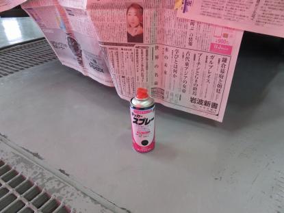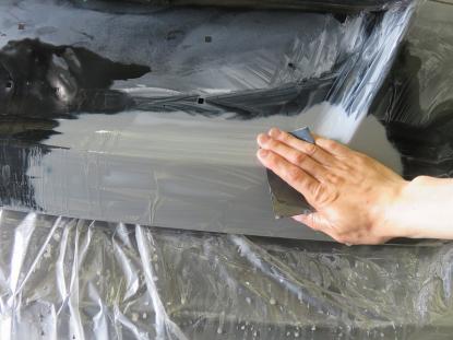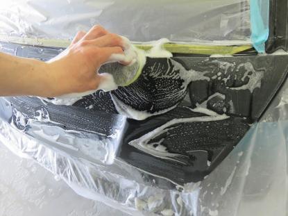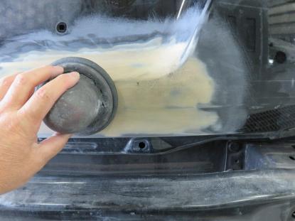 サフェーサーを吹き付ける前にガイドコート(黒い粉)をし、小さな穴や傷を見落とさないように最終確認します。 |
