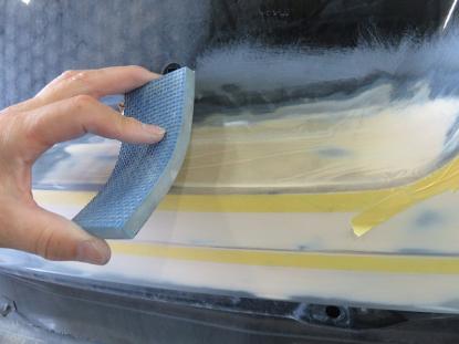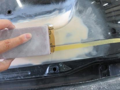 空研ぎからはじめます。目視ではわからない位のひずみを、塗装職人の手のひらの感触で取り除きながら平滑に仕上げていきます。 |