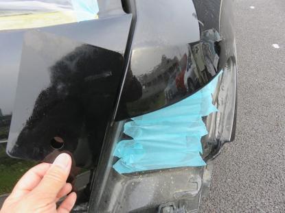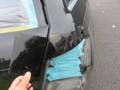 元の形に戻ったところで、新品のリヤバンパーを仮組みします。バックドアとの隙間や高さを確認してすべての板金作業が終了です。 |