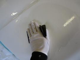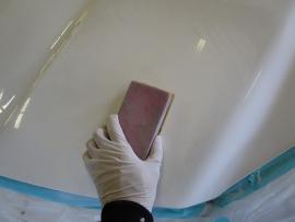 240番のペーパーで傷を削り取り、塗装面の段差をパテで平滑に仕上げていきます。 |