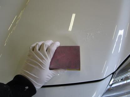 赤外線乾燥機で強制乾燥後、始めに320番のペーパーで空研ぎを行います。その後、800番のペーパーで水研ぎを行ってボンネット全面の下地を仕上げていきます。 |