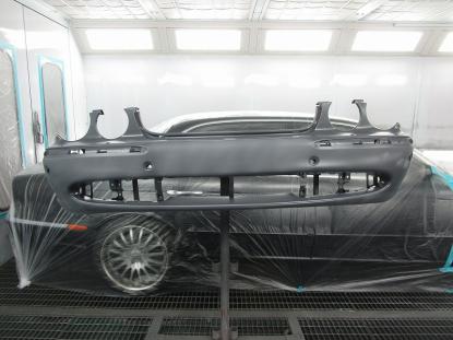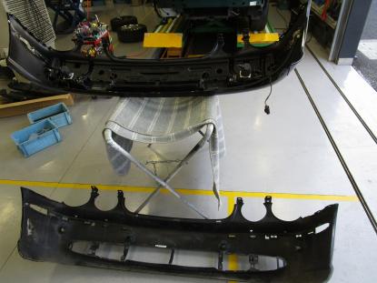 幸い内板骨格にダメージがありませんでしたので、新品のフロントバンパーを仮組みして板金作業が完了です。 |