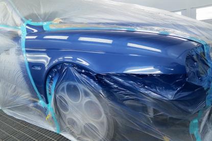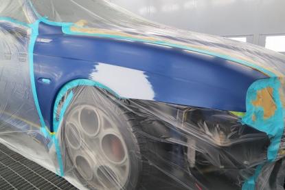 水磨ぎ後、マスキングの作業が終わり塗装の前の準備作業が完了です。毎日、異なる気温や湿度を考え、最適なシンナーを選択し156GTAのオリジナルの塗装肌を忠実に再現していきます。 |