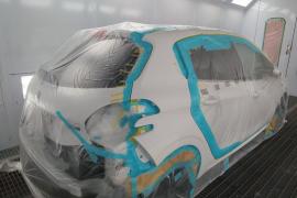 その後塗装ブースにプジョー208を入れてマスキング作業を行います。 |