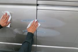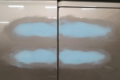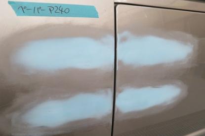 短波と呼ばれる赤外線乾燥機で60℃×20分、強制乾燥させてから、ガイドコートと呼ばれる黒い粉を付けてサンディングします。120番→180番→240番と言う風に少しずつ細かいペーパーで仕上げていきます。 |