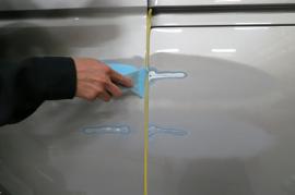 マスキングです。今回は自費での修理ですので、あまり部品を取り外さなくても綺麗に見えるように、少し工夫をしてプレスライン等を使いうまく分からなく塗装作業しました。 |