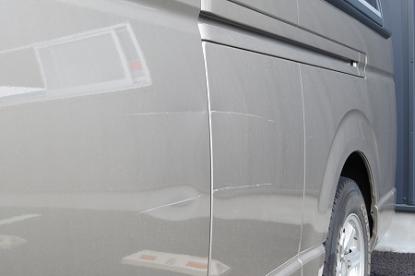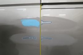 左スライドドアと左リアフェンダーを柱にぶつけてしまい、ダメージを受けてしまったお車です。車両保険を使って修理する予定でしたが、最近改定された自動車保険料率改正(事故有り係数の導入)により車両保険使用後3年間の保険料増額のお支払いを考えますと、今回は車両保険を使わず修理したほうがいいと判断し、自費で修理致しました。 |