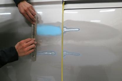 ここでは、小さなヘラで付けたパテをパテワイパーと呼ばれる長い定規のようなもの使って平らになるように付けていきます。坂本オート・サービスでは、さまざまな道具を使いこなしており、ワイパーを使うことによってパテを付け終った時点で、すでにほぼ完璧に平らになるからです。 |