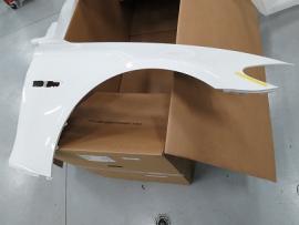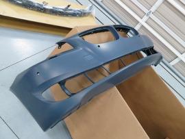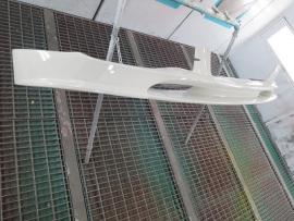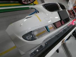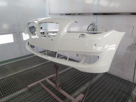 新品パーツを800番から1000番の耐水ペーパーでサンディング後、シリコンオフで脱脂を行います。その後、バンパーを専用の台にセットし、車両に取り付けられている状態を再現して塗装をします。 |