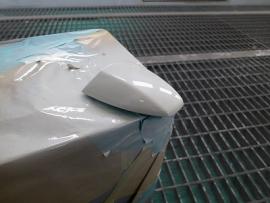 ルーフの傷に2液型サフェーサーを塗装します。 短波と呼ばれる赤外線乾燥機で60℃×20分、強制乾燥させた後、800番から1000番の耐水ペーパーでルーフ全体に水磨ぎを行います。 |