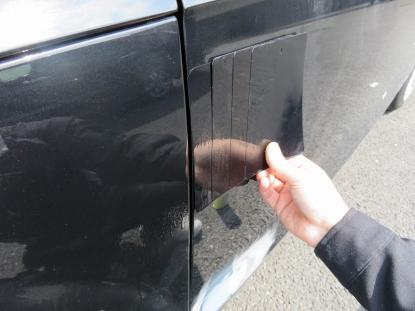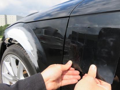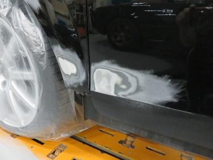 ほとんどヘコミはありませんでしたので、摺りあわせと呼ばれるサンディングをしてから薄くパテを塗って平らに仕上げます。ここで板金作業が完了です。 |