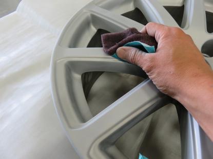 続いてホイールの修理です。リムに付いたガリ傷は、サンディングして平らに仕上げます。 |