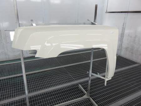 新品のフロントフェンダーに2液型のカラーサフェーサーを塗装します。 |
