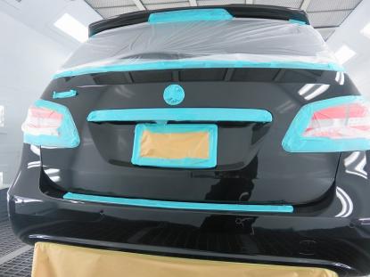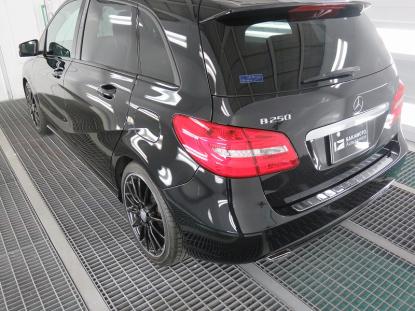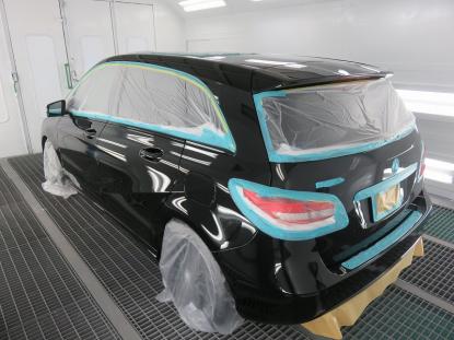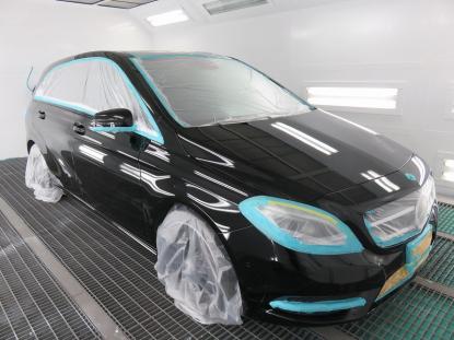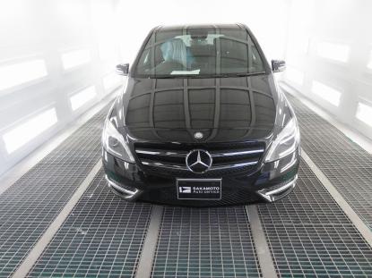 塗装乾燥ブースにメルセデスベンツB250(W246)を入れ、60℃×1時間の加熱乾燥を行います。この強制乾燥によって耐久性の高いコーティング被膜を形成することが出来ます。 |