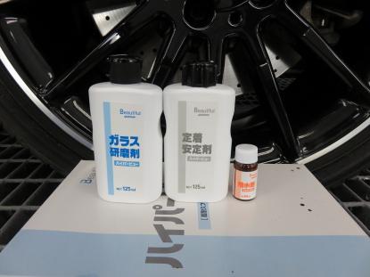 B250のルーフはガラス製ですので、ガラス専用の撥水剤を使用します。ボディとは違いガラス研磨剤から定着安定剤そして撥水剤と三つの工程を経て完成します。 |