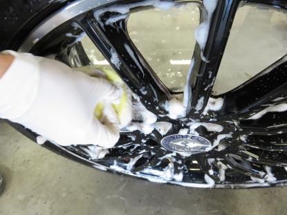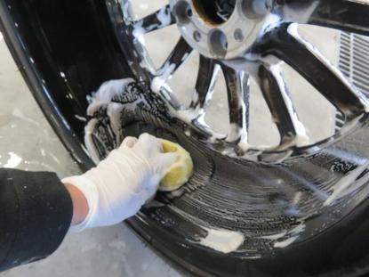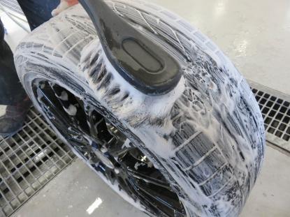 続いてホイールコーティングです。付着している汚れやブレーキダストを洗剤で水洗いし裏面はもちろんですがタイヤまで手を抜かず掃除していきます。 |