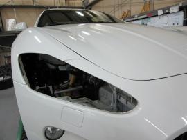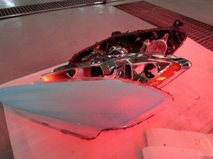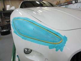 次はヘッドランプを取り外しに掛かります。ご覧のようにフェンダーの裏からネジで留まっている為、ライナーを外して作業していきます。 |