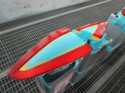 塗り分けした所のマスキング跡の段差を無くすため、最後にテールランプ全体にクリアーを塗装して仕上げています。 |