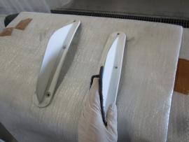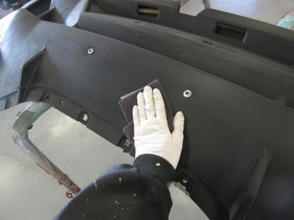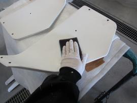 FRP製パーツの下地作業です。細かなピンホール等を確認しながら、表面をサンディングしていきます。 |