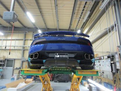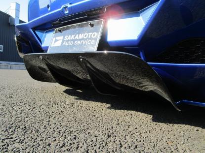 車両をリフトアップして、リヤディフューザーのフィッティングを行います。 |