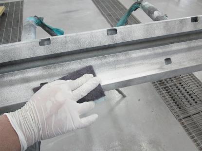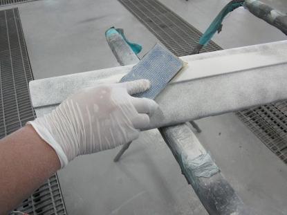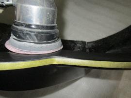 塗装の作業に移ります。表面をダブルアクションサンダーで削ってから、2液型のカラーサフェーサーを吹き付けていきます。 |
