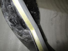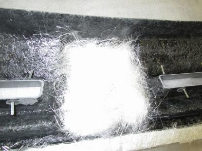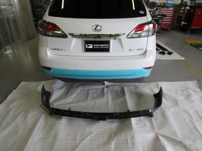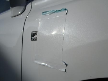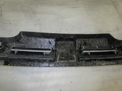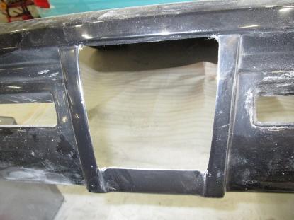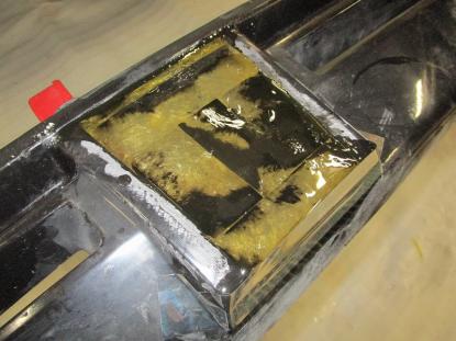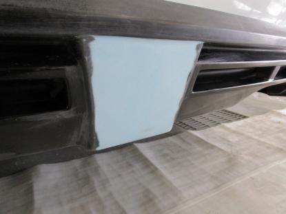 K様からリヤアンダースポイラーの真ん中に付くバックランプの穴を埋めてほしいとのご要望ですので、樹脂を塗ってからガラス繊維を貼り付けていきます。 |