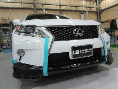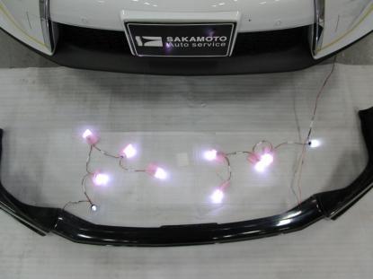 フロントスポイラーからフィッティングしていきます。LEDランプの点灯確認も同時に行います。 |