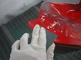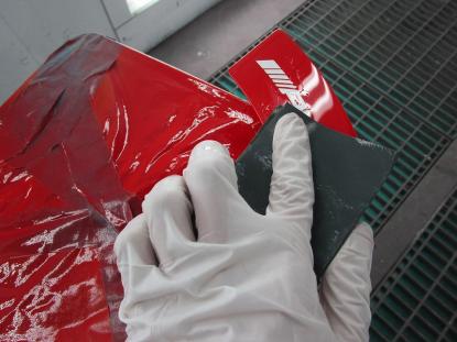 ロゴ入れです。表面をサンディングしてからAMGロゴを貼り付け、その上からクリアーを塗装します。 |