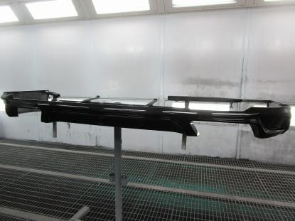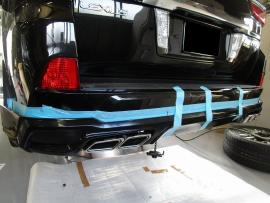 純正リヤバンパーのマフラー開口部などを加工しながら、ダブルエイトのアンダースポイラーを取り付けていきます。 |