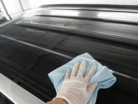コーティング剤を塗った塗装の表面が白く濁った状態になるまで時間を置いてから、専用のクロスで拭き上げてボディコーティングの完成です。 |