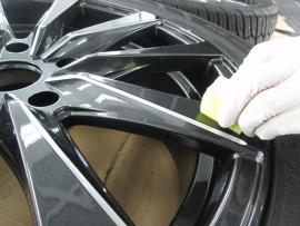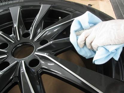 専用のクロスで拭きあげ、ホイールの撥水コーティングの完成です。 |