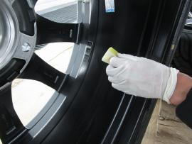 ホイールの水気を完全に取り除いてから、シリコンオフで十分に脱脂を行い専用のスポンジでコーティング剤を隅々まで塗っていきます。 |