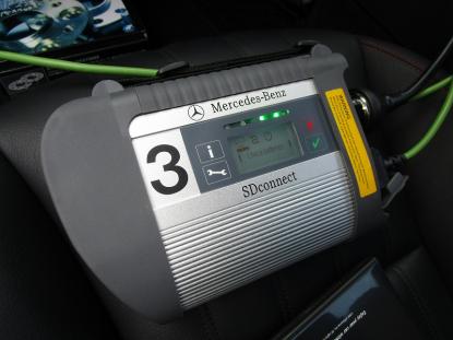 最後にヘッドライトのコーディングです。ヨーロッパ仕様のライト設定にするため、メルセデスベンツ専用のテスターを使い、コンピューターの中のプログラムを書き替えていきます。 |