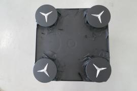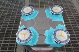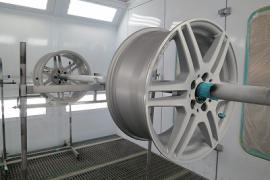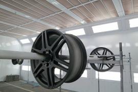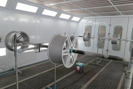 タイヤを取り外してからサンディングします。いつも通りに完全な手作業になりますが、足付け作業を確実に行います。その後、清掃・脱脂し特殊なアルミ素材専用の密着プライマーを塗装してから上塗りします。裏の隅々まできれいに塗装出来るように、このような専用の台にセットします。また、見ずらいですがホイールとボルトが当たる締め付け部分はマスキングします。なぜなら、ここまで塗装してしまいますと、締めた後に塗装はがれとともにボルトがゆるんでしまう可能性があるからです。 |