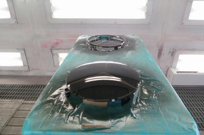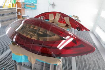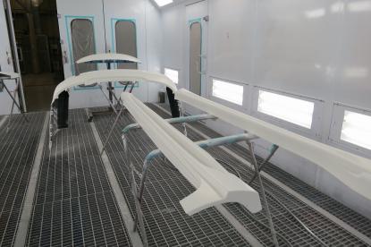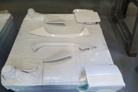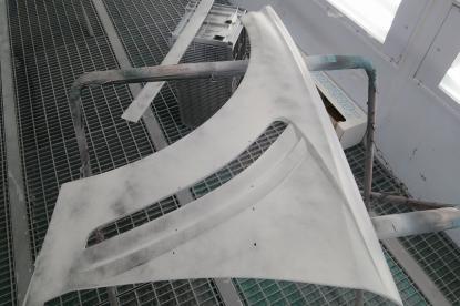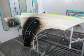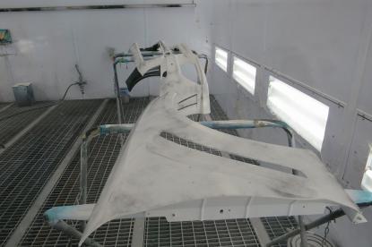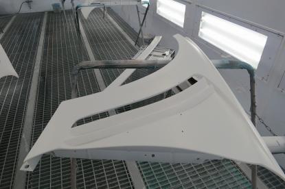 仮組みが終わると、パーツの表面のデコボコをダブルアクションサンダーで削り落とし、小さなキズやFRP特有の巣穴と呼ばれる気泡のようなものをパテ等を使って丹念に1つ残らずなくす作業を行い、二液型のカラーサフェーサーでシールします。 |