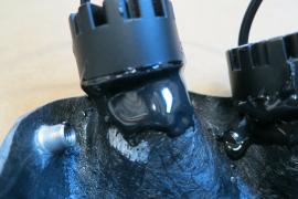 フロントバンパーに取り付けるLEDランプは、ステーが取付け出来ない為、このように強力ボンドで接着させます。 |