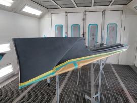 このようにサフェーサー塗装→水磨ぎ→クリアー塗装→水磨ぎ→マットブラック塗装→マスキング→赤塗装→マスキングを剥がし→クリアー塗装と何度も細かく工程をわけて作業いたします。ツートン塗装やとカーボン残し等の塗装はとても手間がかかります。 |
