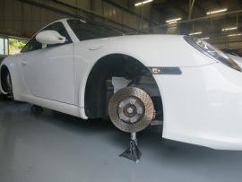 コーティング剤をすみずみまで塗っていきます。その後、コーティグ剤を拭きあげた後、いつも通りサイマ社製の塗装乾燥ブースにポルシェ911を入れ、60℃×1時間の加熱乾燥を行います。この熱処理により、コーティング被膜をしっかり硬化させることできます。 |